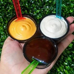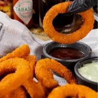 6 unidades de anéis de cebola empanados e fritos + molho barbecue, ideal para acompanhar o seu lanche.